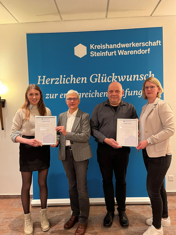 Nach dem Grußwort von Ann-Kristin Erdmann, Bereichsleiterin Innungen der Kreishandwerkerschaft Steinfurt Warendorf, erfolgte die Ehrung der Prüfungsbesten. Ausgezeichnet wurde Sophia Waldikowski, ausgebildet im Betrieb Mense GmbH, Oelde, die in der Gesamtprüfung die höchste Punktzahl erreichte. Ihr sowie ihrem Ausbildungsbetrieb wurden Ehrenurkunden und ein Präsent der Innung überreicht.